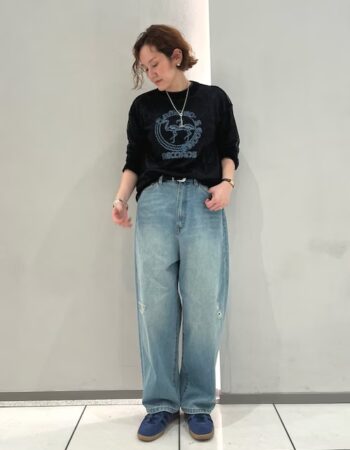 ヴィンテージライクな英字プリントのシャツと、褪せたピンクのテーパードパンツ。