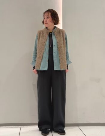 リラックス感の出るロングベスト。裏毛なので素材でメリハリを。