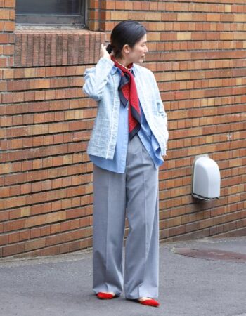 ブラックコーデにパープルを一点投入しますと、ぐっと春の装いに。