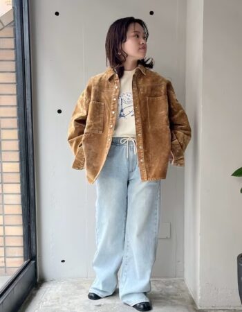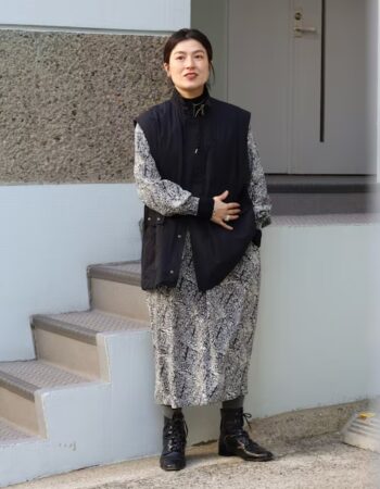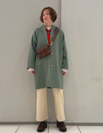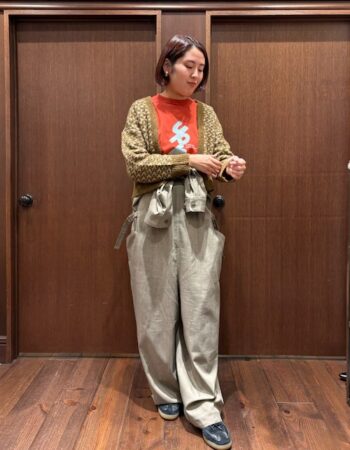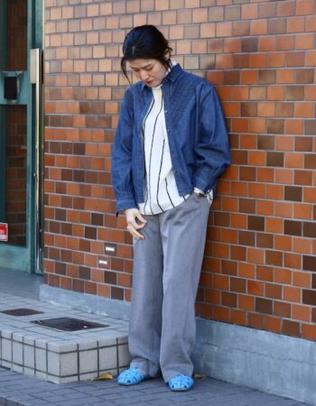 鮮やかなピンクもたまには着たくなります。色が綺麗に見えるように、ホワイトベースのパンツにしました。さりげなくストライプ柄なのがシンプル過ぎず良い感じです。