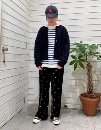はっと目が覚めるようなブルーのパンツ。 チャレンジカラーのように思いますが、 以外といつものコーデに馴染みます◎