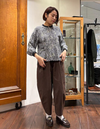 人気の馬柄ブラウスとパッチワークデニムを合わせたコーディネート。