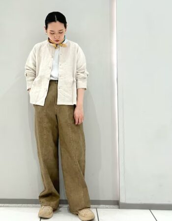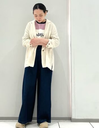 気分が上がるカラーコーディネートを。 パンツにグレーを合わせて、程よく落ち着きをプラス。