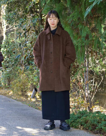 ざっくりとした風合いのニットを重ねて。ハーフジップのニットは