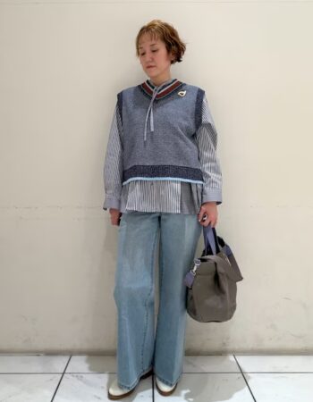 フロントは深いVネックなので、インナーやアクセサリーの組み合わせを楽しみつつ、バックスタイルはセーラーカラーがポイントに。