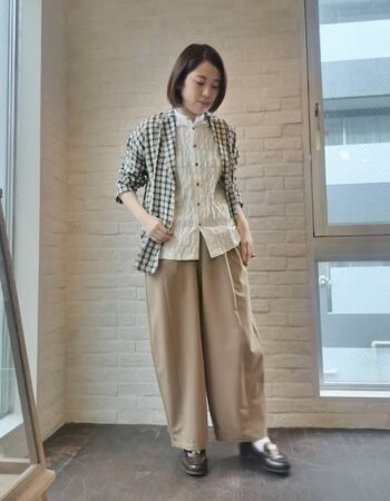 夏の主役になるグリーンのスカート。 シアーのチェックブラウスと合わせ爽やかなコーディネートにしました☺︎