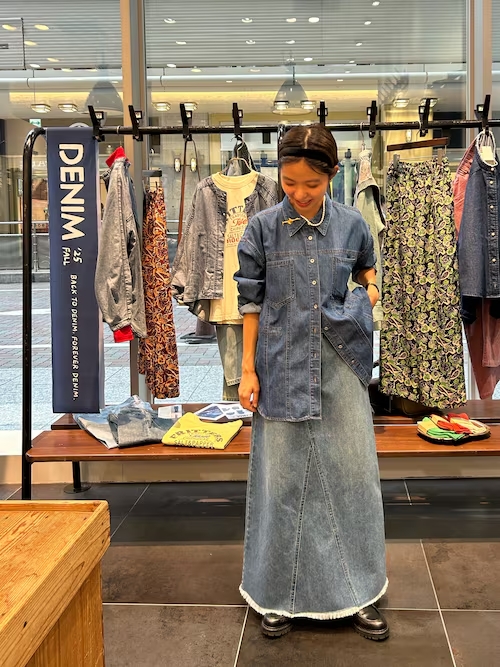 デニムのセットアップにブローチやパールネックレスの小物使いで小慣れ感を演出◎ 店頭には季節の変わり目におすすめなデニムアイテムを多数ご用意しております。 是非お立ち寄り下さいませ。