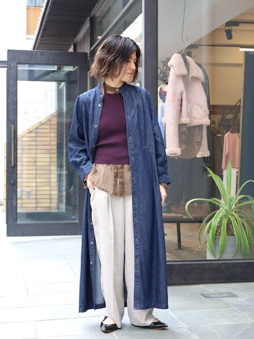 しっかり長さのあるデニムワンピースは1枚着でも、羽織としても重宝します。