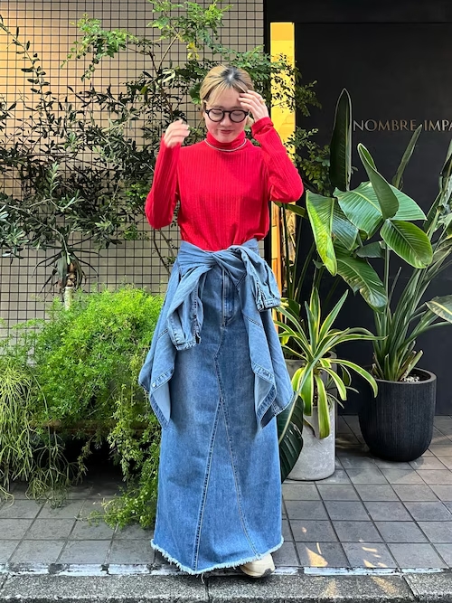 しっかりの長さのあるデニムスカートにデニムシャツを腰巻きしてジャンプスーツ風に。