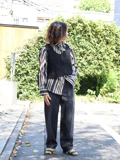 ブラウスにデニムは間違いない!ですが、そこにベストをオンすることでピリッとした締まりも。