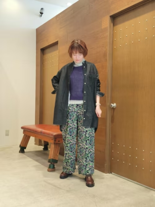 NOMBRE IMPAIRのリバーシブルニットベストを主役に、ゆったり羽織れるロングシャツを合わせ、ボトムは存在感のある総柄パンツで、シンプルなトップスに遊び心をプラス。