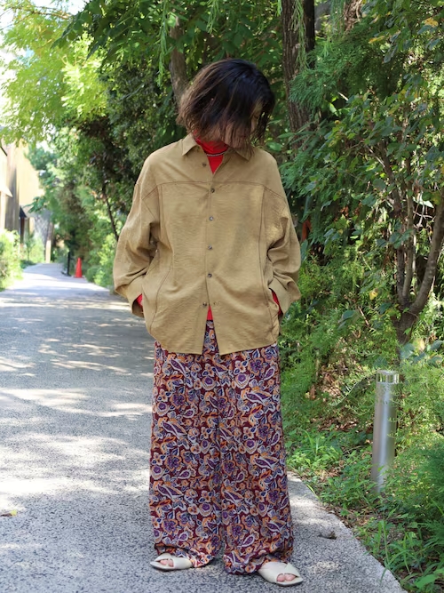 スエード調のシャツにプリントパンツで古着ライクな着こなしに。