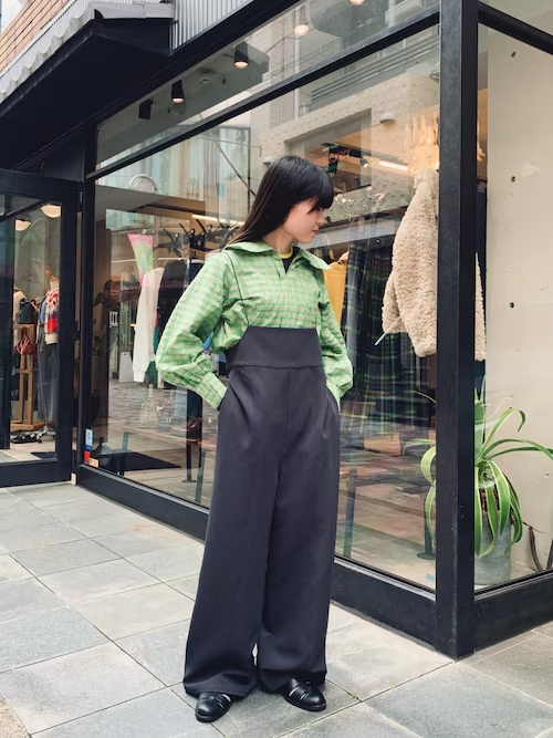 発色のよいグリーンと光沢感のある生地感かわいいビックカラーのブラウス。