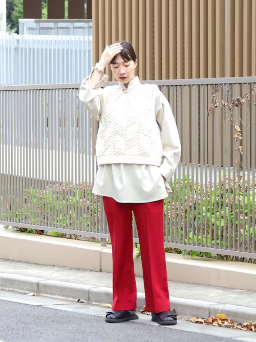 新作のカルゼパンツは、ややトーンを落とした深みのある赤が印象的です。