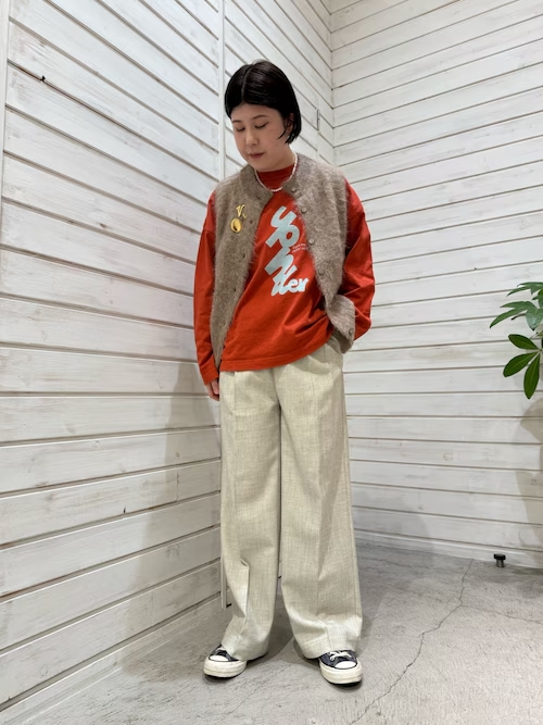 カラーTシャツに羽織るだけでぐっと冬らしいスタイルに。