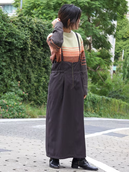こっくりとしたブラウンサロペットが大人っぽいリラックススタイルに仕上げてくれます。