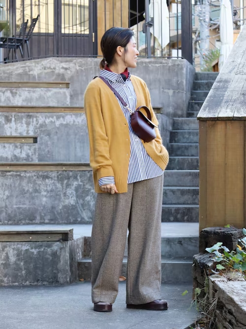胸元にはスカーフ、ブローチとシンプルスタイルな中にも遊び心をプラス。