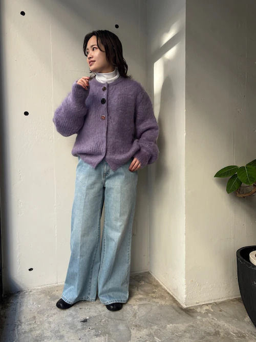 温かみ感じるニットにストレートラインが際立つデニムを合わせてスッキリとしたシルエットを意識。
