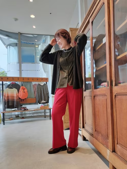 オリーブ色をベースに、赤を効かせたホリデーシーズンにおすすめなコーデ。