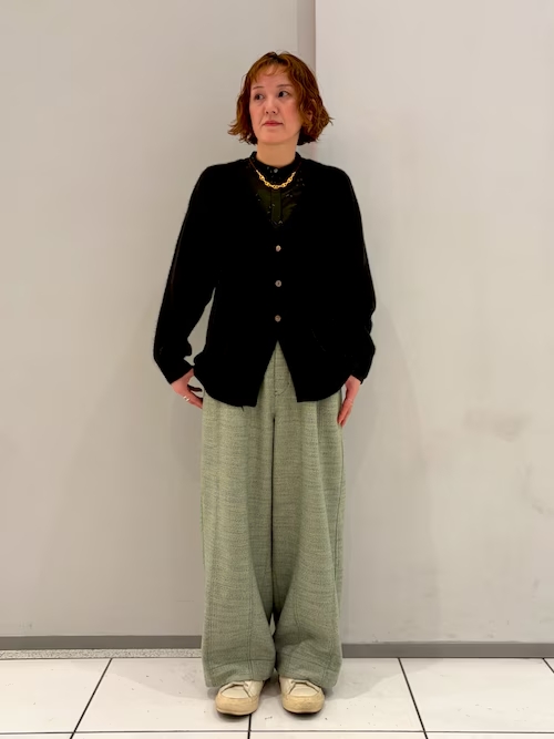 ふわふわのフォックスカーデのインに新作のプリントブラウスをプラス。