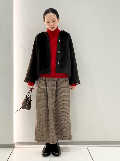少し落ち着いたカラーのコーデも、ポイントに赤を持ってくるだけで明るく、メリハリがつくので◎