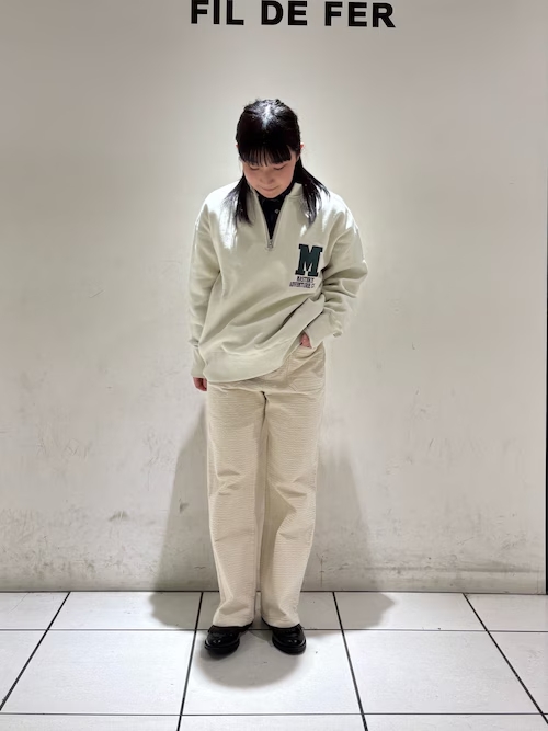 ややゆとりのあるハーフジップに、フレアなシルエットのコーデュロイパンツを合わせた抜け感のあるカジュアルスタイルにしました。