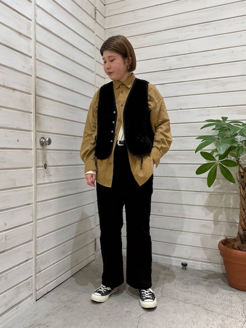 イエローベージュのシャツをブラックアイテムで引き締めて。