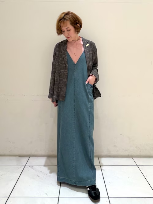 ツイードライクなゆるジャケットを羽織って引き締めました。