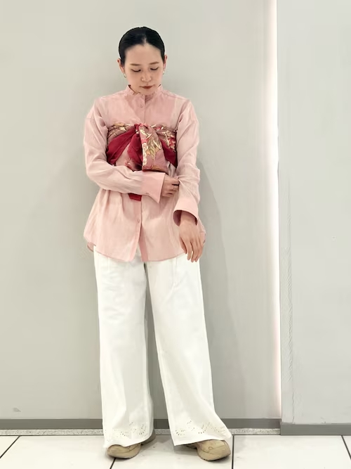 春らしい優しいピンクのブラウスに、スカーフをビスチェの様に巻いてみました!