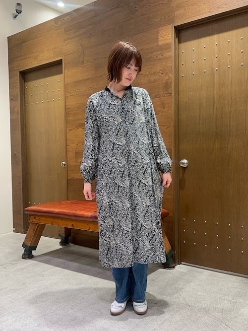 柔らかなレーヨン素材で、動きに合わせてきれいに落ちるシルエットが魅力のワンピース。 今回はデニムとレイヤードしました。