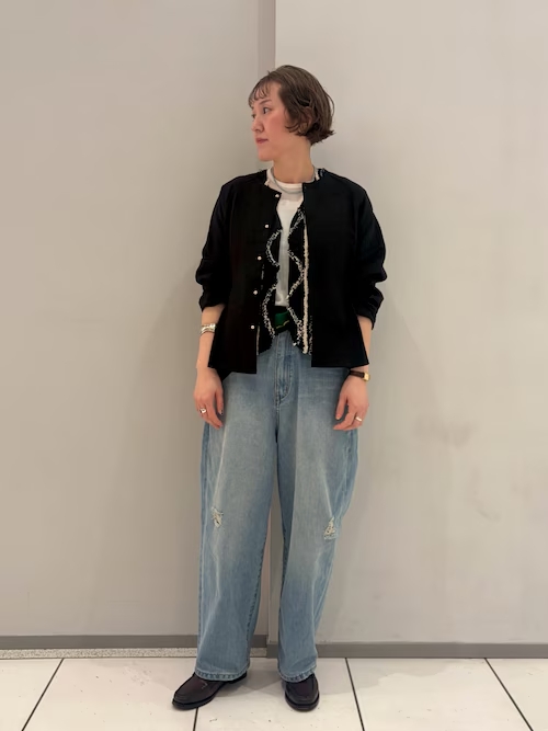 ショート丈のリネンの羽織とモノトーンジャガードのレイヤード。