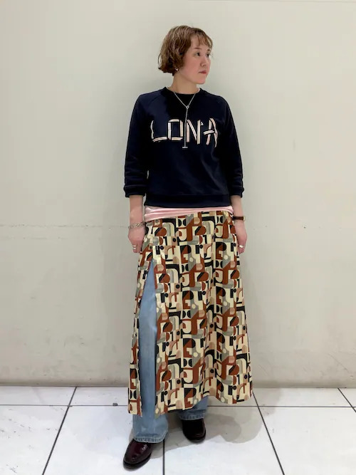 どこか懐かしい雰囲気のある、オリジナルの幾何柄スカート。