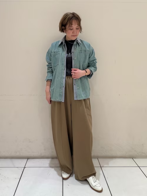 シャツにデニムの羽織を重ねて、襟元に立体感を出しました。