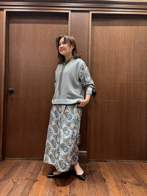 しっかりめな柄がプリントされたワンピースもベストと合わせて見せ方を変えるとコーディネートにも取り入れやすくなります。