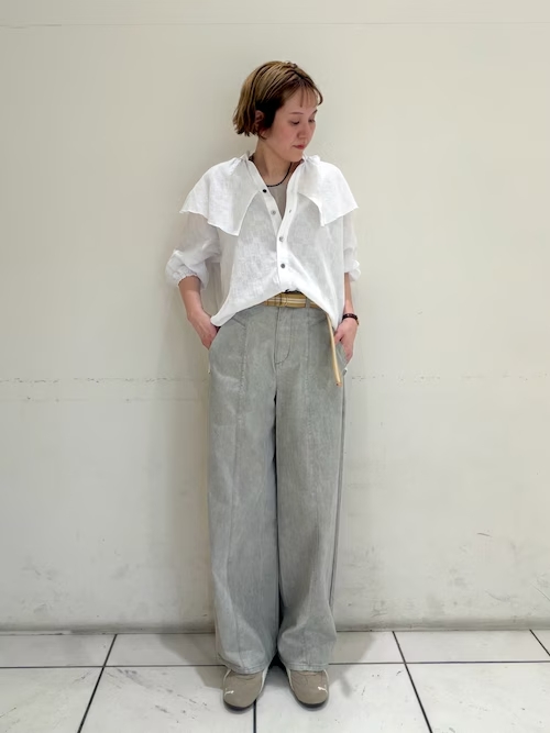 ライトグレーとベージュを組み合わせて、淡色コーデにまとめました。 シンプルなスタイリングの主役になる一枚です。
